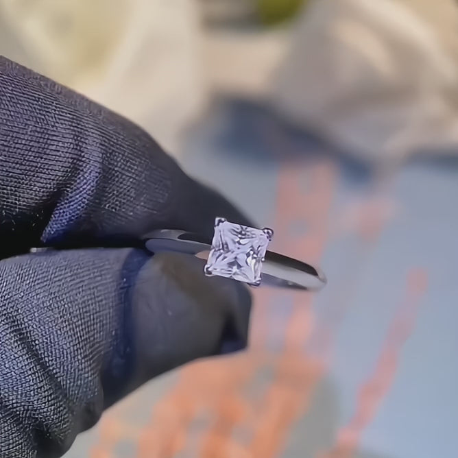 Experience the timeless elegance of the Rosalind Solitaire Ring set with 1 carat Princess Cut Moissanite solitaire. Crafted with a sterling silver band and coated in platinum, this ring showcases a stunning princess cut moissanite stone. With its brilliant sparkle and durable materials, it's a perfect choice for any occasion.