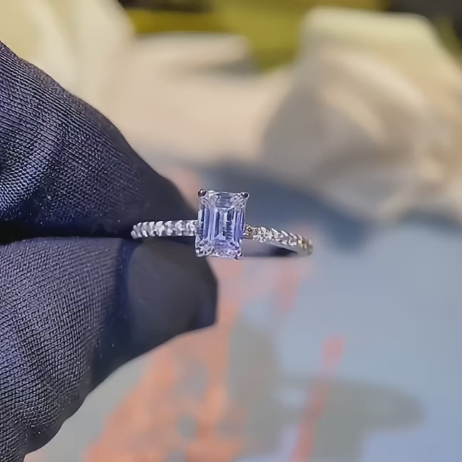 Expertly crafted, the Seraphina Solitaire Ring set with 1 carat Emerald Cut Moissanite solitaire, showcases a dazzling emerald cut stone set in a sterling silver band with a platinum coating. This ring exudes elegance and sophistication, making it the perfect choice for those seeking a timeless and affordable alternative to traditional diamond rings.
